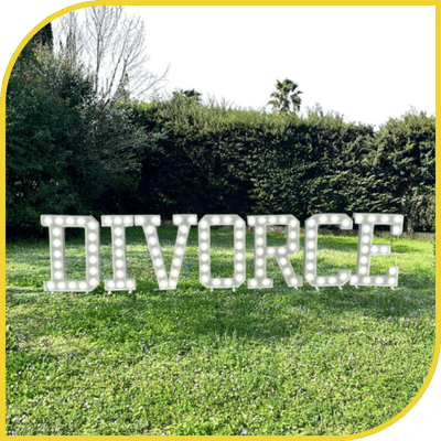 Illuminez cette nouvelle étape de votre vie avec éclat grâce à notre forfait DIVORCE géant lumineux conçu dans nos ateliers à Nice. Solution parfaite pour créer une ambiance festive et libératrice lors de votre divorce party, célébration de liberté, nouveau départ et fête audacieuse dans les Alpes-Maritimes et le Var.