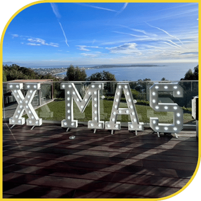 Transformez votre événement de fin d’année en célébration féerique avec notre forfait XMAS géant lumineux fabriqué dans nos ateliers à Nice. Solution parfaite pour créer une ambiance de Noël spectaculaire lors de vos soirées d’entreprise, fêtes privées, marchés de Noël et célébrations festives dans les Alpes-Maritimes et le Var.
