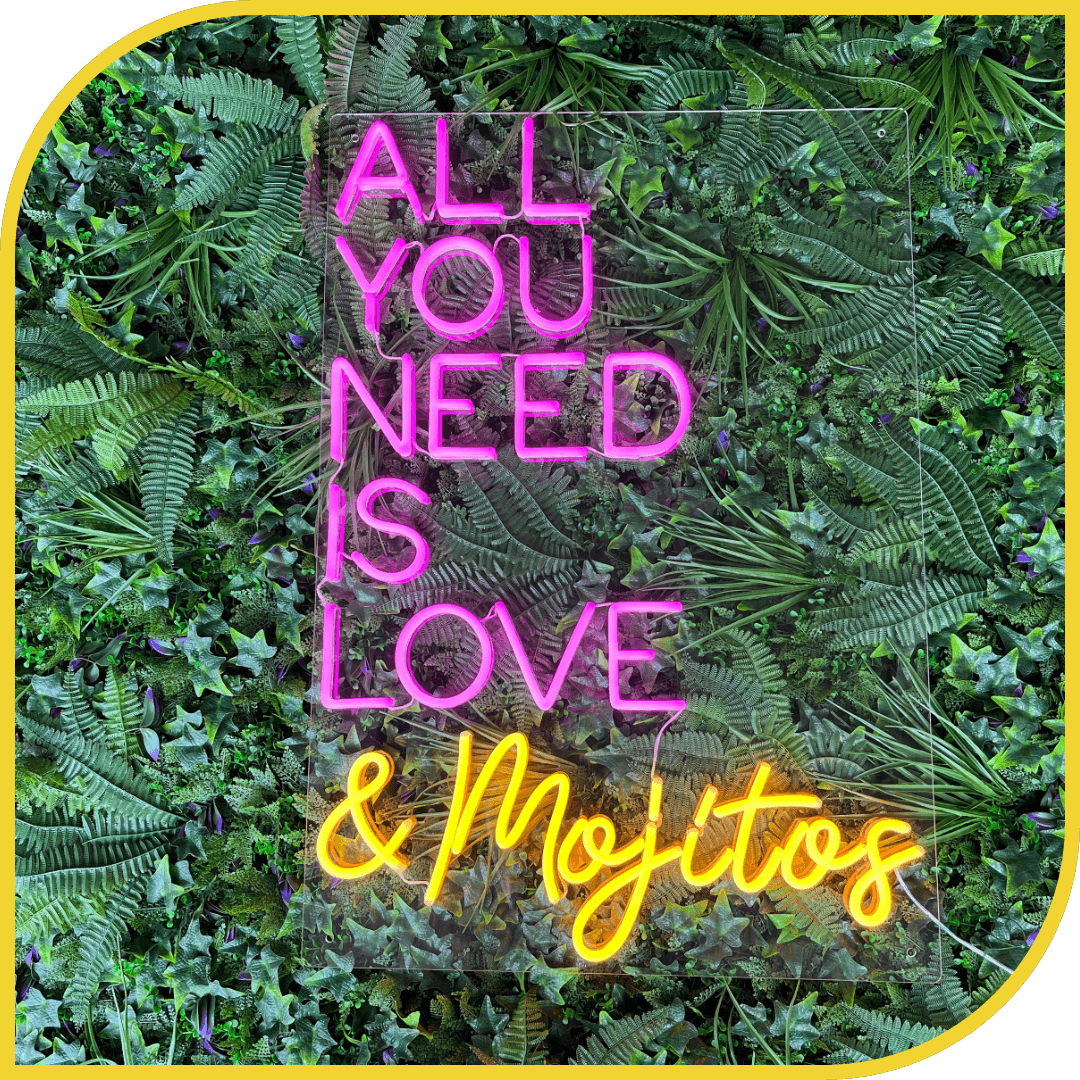 Quelle que soit l’occasion, notre néon « All you need is love & Mojitos » transforme chaque moment en une fête. Créez une ambiance décontractée et amusante pour vos invités, qu’ils savourent un mojito ou simplement l’amour et la joie de la célébration.